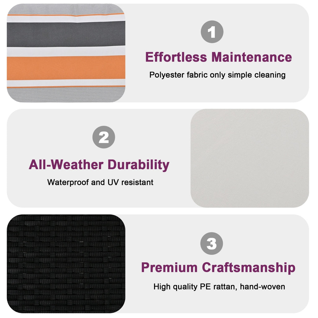 • Vibrant Pillows: Accompanied by a generously sized seat cushion and back cushion, this ensemble is further enhanced by the addition of two vibrant pillows. These colorful accents not only offer an extra layer of comfort but also allow for personalized placement – whether nestled at your side or gently propped behind – ensuring a truly indulgent relaxation experience.